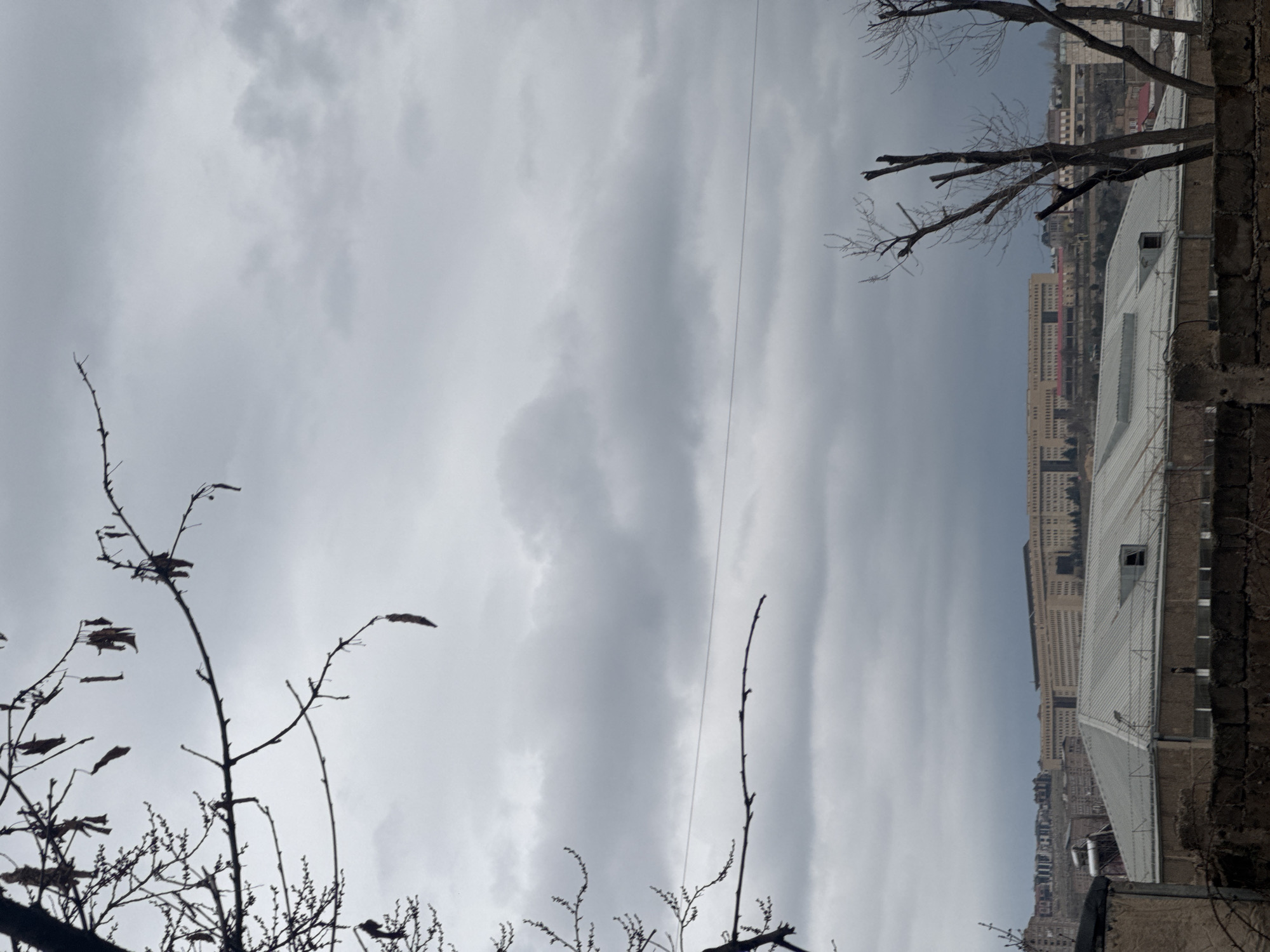The image depicts a cityscape under an overcast sky. In the foreground, skeletal tree branches reach towards the sky, some with a few dried leaves clinging on. A utility line stretches across the upper portion of the image. In the background, rows of buildings ascend a hillside, with a large, light-colored structure dominating the view on the right. A portion of a wall, possibly brick or stone, is visible in the extreme right. The location is likely Yerevan, Armenia, given the architectural style and urban layout. No people are visible in the frame.