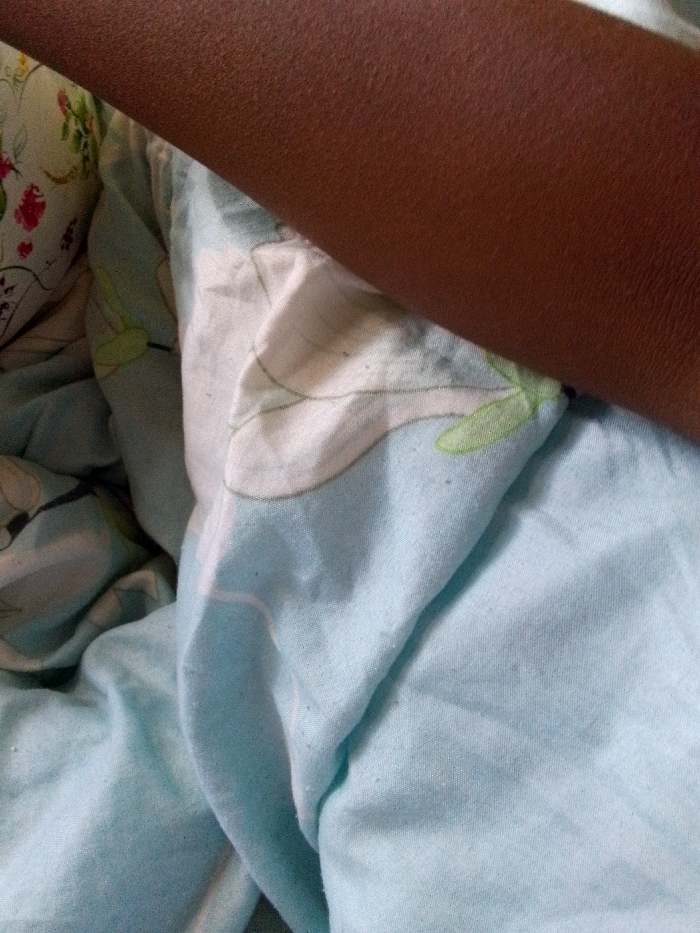 A forensic description of an indoor scene in Kalimoni ward, Kenya. The image captures a close-up view of a dark brown human forearm, positioned diagonally from the upper right to the lower left. The arm exhibits visible skin texture, including small follicular elevations. It rests upon a light blue patterned fabric, likely bedding, which features white and light green stylized botanical motifs. Small fibers and pilling are discernible on this fabric. A second, multi-colored floral patterned fabric, displaying red and green elements on a white background, is partially visible in the upper left quadrant. No other individuals or active interactions are observed. The environment is consistent with a private indoor space, likely a bedroom, given the presence of bedding.