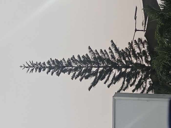 The image depicts a tall, slender, conical conifer tree centrally positioned against an overcast, pale gray sky in the city of Unknown, Unknown. The tree exhibits symmetrically arranged, tiered branches. In the lower-left foreground, a light-colored rectangular structure, possibly a sign or portion of a building, is partially visible. A street light pole with a modern, flat fixture is present in the lower-right midground, positioned above some green foliage. A faint, diagonal light streak is visible in the upper-right portion of the sky. No individuals or discernible actions are observed within the frame.