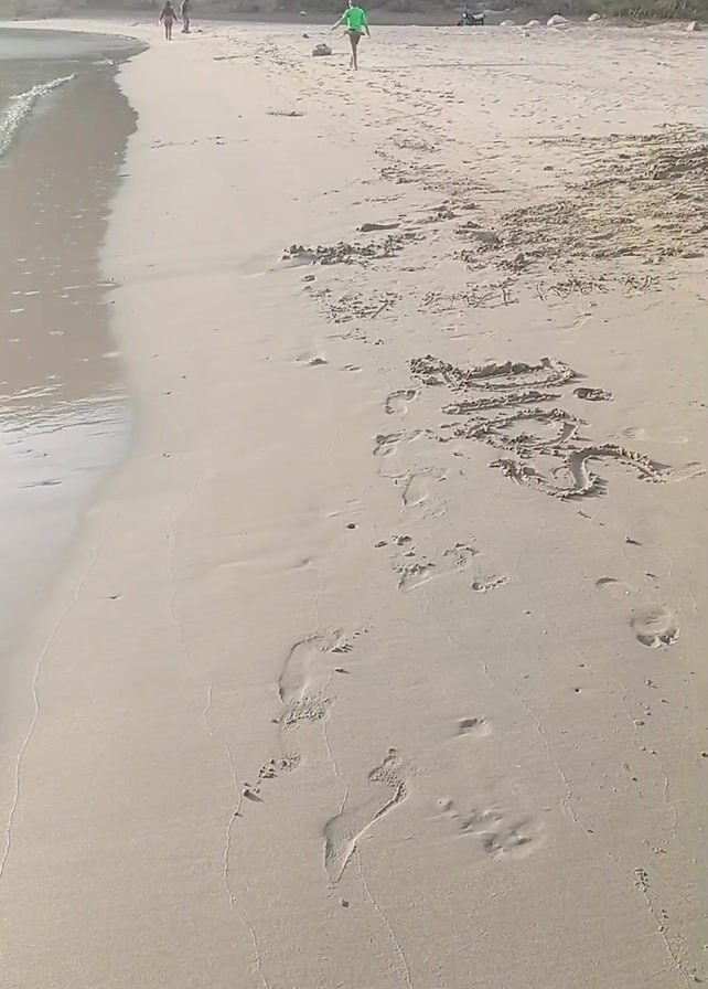 sandy beach with footprints in the foreground, stretching towards the waterline