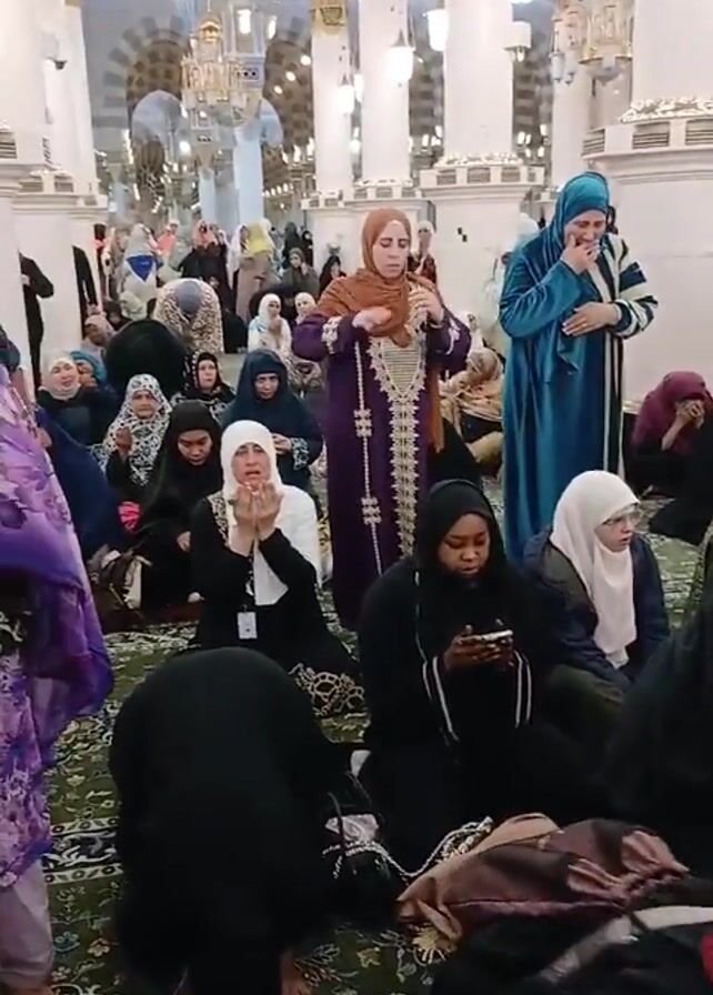 crowded room in a mosque. Many women, wearing a variety of modest dress including headscarves, sit on patterned carpets, in the midst of prayer, some with their faces bowed, others with hands raised in supplication. Some are using phones. The mosque features high ceilings, ornate chandeliers, and white columns. Other people are seen moving in the background.