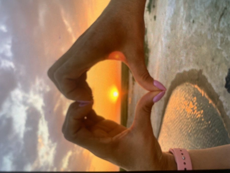 The image displays a close-up perspective of two human hands, likely a single individual's, positioned in the foreground to form a heart shape