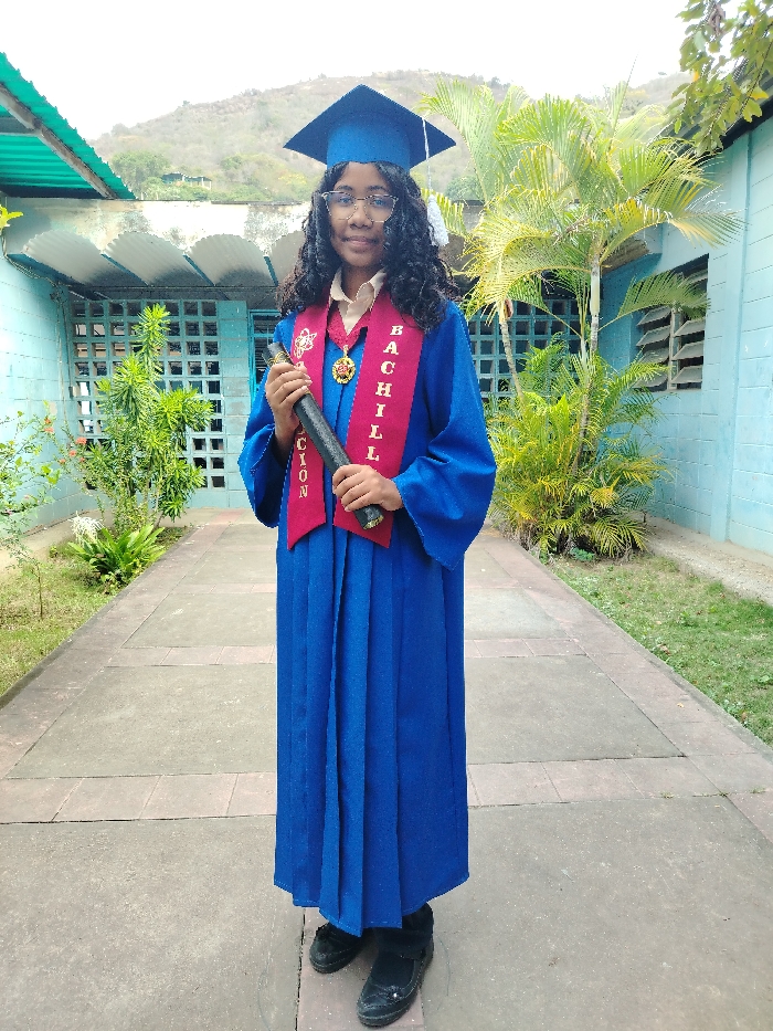 A young female individual is depicted standing full-body on a paved walkway, facing the viewer directly. She wears a royal blue graduation gown and a matching mortarboard. A red stole is draped over her shoulders, featuring "BACHILLER" embroidered vertically in white capital letters on the right side and "CION" partially visible on the left. A gold-colored medallion on a red ribbon is suspended around her neck. She holds a rolled black document, secured with a gold-colored band, in both hands at waist level. Her dark, curly hair frames a face with eyeglasses, and she exhibits a slight smile. The background consists of light blue institutional-style buildings with various window configurations, including open latticework and louvered panels. Lush green foliage, including a prominent palm specimen, borders the walkway and structures. Hilly terrain, partially vegetated, is visible under an overcast sky in the distant background. The scene is located in the city of Las Tejerías, Venezuela.