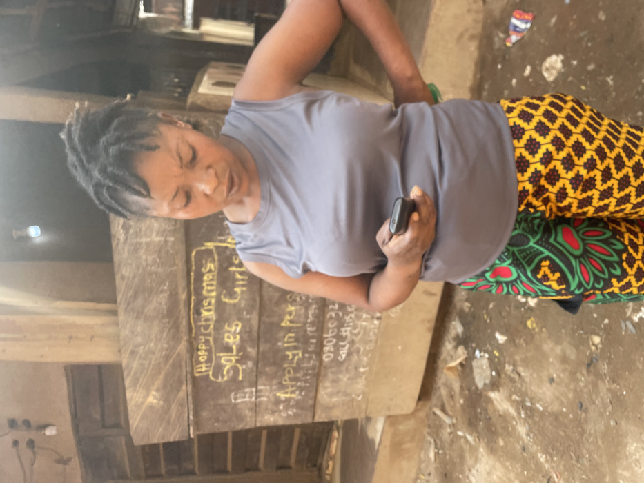 An adult female stands outdoors in Onitsha, Nigeria, looking intently at a black mobile phone held in her right hand