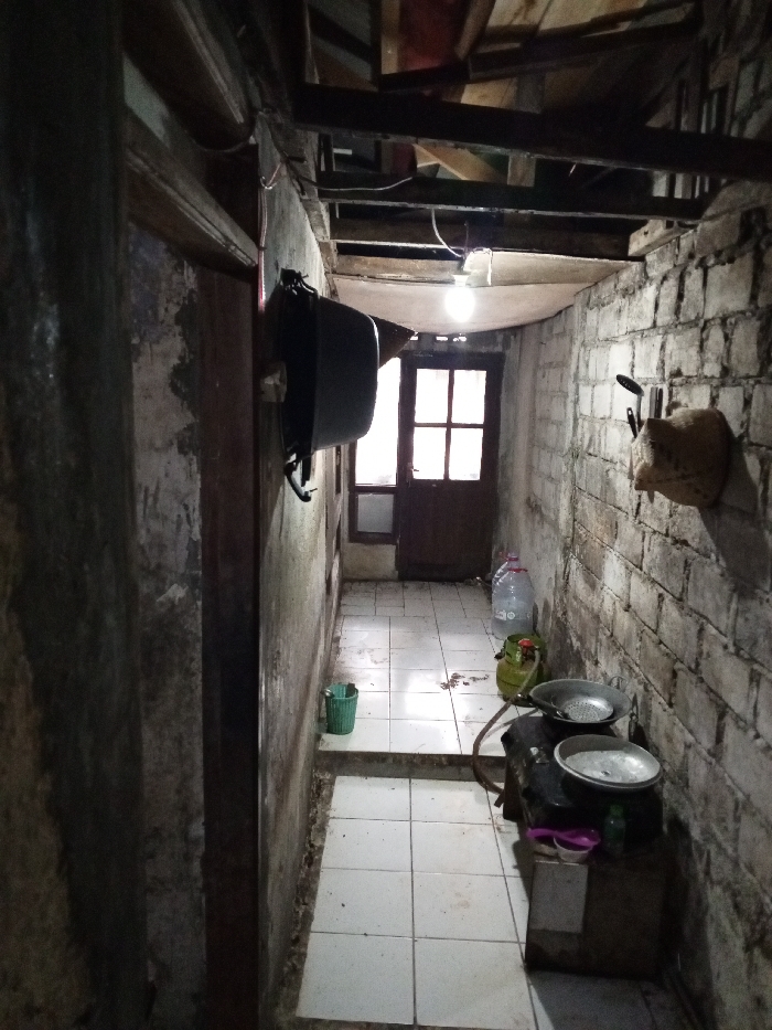 A narrow, dimly lit kitchen space. A weathered wall with a hanging pot contrasts against white tiled flooring. A stove with pans sits along the right wall, near a green gas cylinder. A partially visible door is at the far end, allowing light to enter. A bare bulb hangs from the ceiling. The overall impression is of a functional yet aging and unkempt area.