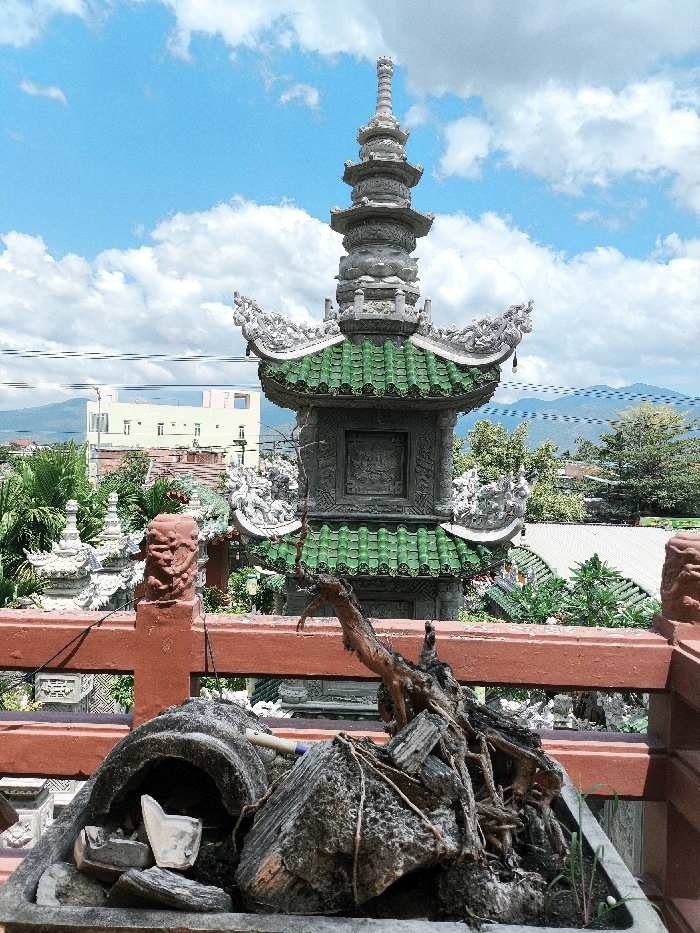 This image presents an outdoor scene in Diên Khánh, Vietnam, viewed from an elevated perspective under a bright blue sky with scattered white cumulus clouds. In the immediate foreground, a reddish-brown balustrade or railing runs horizontally across the frame. A carved finial, resembling a stylized mythical beast's head, caps a post on the left side of this balustrade. Resting directly on the balustrade is a rectangular grey planter containing a rock and root arrangement. This includes several dark grey, irregularly shaped rocks, an overturned, hollowed-out grey object containing white fragments, and a prominent, gnarled dark brown root structure intertwined with the rocks. Small green sprouts are visible within the planter, alongside a light-colored cylindrical object. In the midground, a multi-tiered grey stone structure, resembling a stupa or decorative tower, stands prominently. Its lower section features a square base with visible carved panels, supporting a distinct roof layer with bright green tiles that curve upwards. This green roof is adorned with intricate white sculptural elements along its edges and corners. Above the green roof, the structure continues upward with multiple progressively smaller, stacked grey tiers, culminating in a pointed finial. Beyond the central structure, the background reveals a cityscape. To the left, a light-colored, multi-story building with rectangular windows is visible. The area is dense with green foliage, including trees and palm fronds, interspersed with other rooftops, some with green tiles. In the far background, a range of dark mountains stretches horizontally across the horizon. Faint overhead wires are present in the midground sky. No people are visible in the scene.