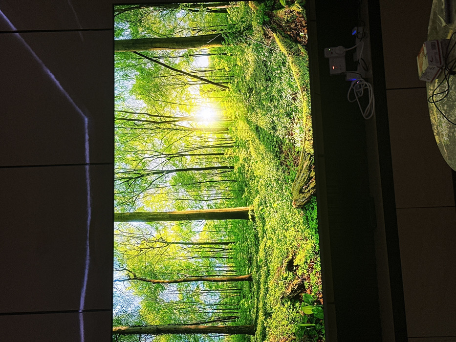 A television displays a forest scene, with sunlight streaming through the trees. Lush green foliage covers the landscape, creating a vibrant and immersive view. The scene has depth and a sense of tranquility. The wall around the TV is dark and includes power outlets and cords. The photograph is taken at an angle, providing a view of the TV screen and its surroundings.