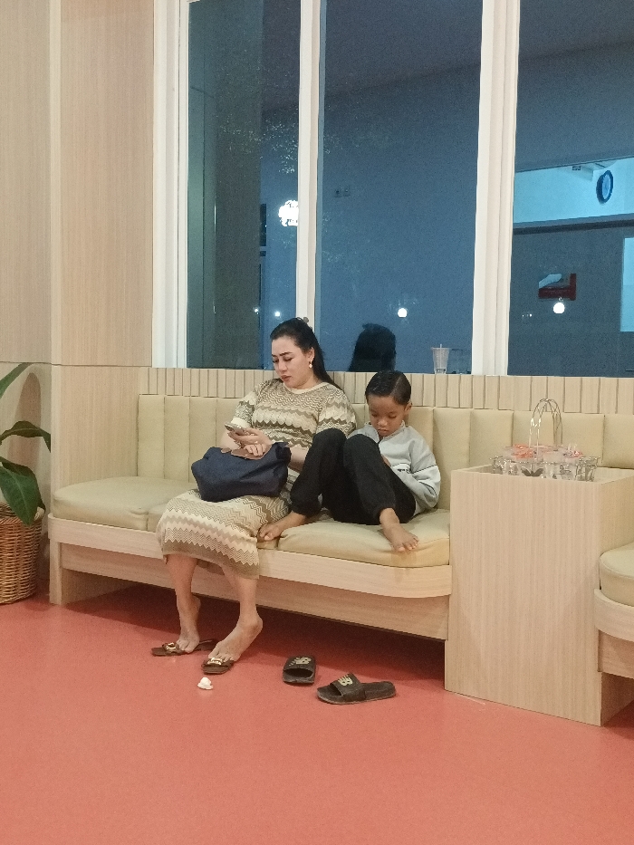 The image portrays an indoor scene at night in Margorejo, Indonesia, featuring two individuals seated on a light-colored, upholstered sofa. An adult woman, wearing a patterned light-colored top and skirt, sits with her bare feet on the orange-red floor; one gold-colored slide sandal is partially on her right foot, and the other is beside it. She is focused on a smartphone held in her hands. A dark blue handbag rests on the sofa to her left. To her right, a young boy, wearing a grey long-sleeved sweatshirt and dark trousers, sits barefoot, also looking down at a handheld electronic device. Two pairs of dark-colored slide sandals are on the floor in front of the sofa, alongside a small white object. To the left, a green plant in a woven basket is visible. A light wooden side table or partition is positioned to the right of the sofa, topped with a clear, multi-tiered container holding small, transparent items. Behind the sofa, a large window with white frames shows a dark exterior with reflections, consistent with nighttime. The interior walls are light-colored with vertical paneling, and the floor is a solid orange-red.