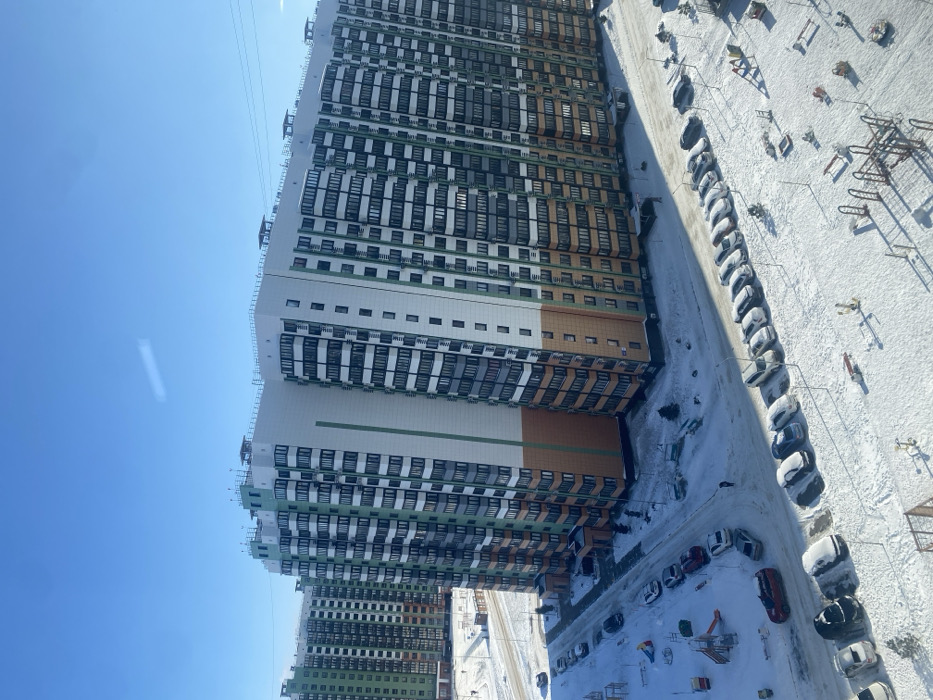 A high-angle shot shows multiple high-rise apartment buildings with a modern facade design, predominantly white, green, and brown. Many windows are visible on each floor. A snow-covered landscape surrounds the buildings. Rows of parked cars, some covered in snow, line the street. A playground area is also blanketed in snow. The sky is clear and blue.