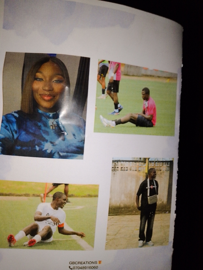 The image displays a photograph of a white page containing a collage of four distinct photographic prints arranged in a 2x2 grid. The top-left quadrant features a headshot of a smiling female with shoulder-length brown hair, blue eye makeup, and a blue and white tie-dye top, wearing a cross pendant necklace against a dark background. The top-right quadrant shows a male athlete with dark skin and short hair, sitting on a green turf field, wearing a pink t-shirt, black shorts, and white athletic shoes. Another athlete in a pink shirt is partially visible standing behind him. The background includes a light-colored concrete block wall. The bottom-left quadrant depicts a male athlete with dark skin and short hair, sitting on a green turf field with a white line. He wears a white t-shirt with a logo, an orange armband, black shorts, and red and black athletic shoes, smiling and looking left. A blurred leg and shoe are visible in the background. The bottom-right quadrant presents a male subject with dark skin and short hair, standing outdoors with hands in pockets, wearing a dark t-shirt, dark trousers, white athletic shoes, and a light-colored cross-body bag. He is looking to his right. The background features a light-colored concrete block wall and a dirt or paved surface. The specific location within the city of Rayfield, Nigeria, is not discernible from the visual information presented in the images. Text at the bottom of the page reads "GBCREATIONS" and "07048916060."