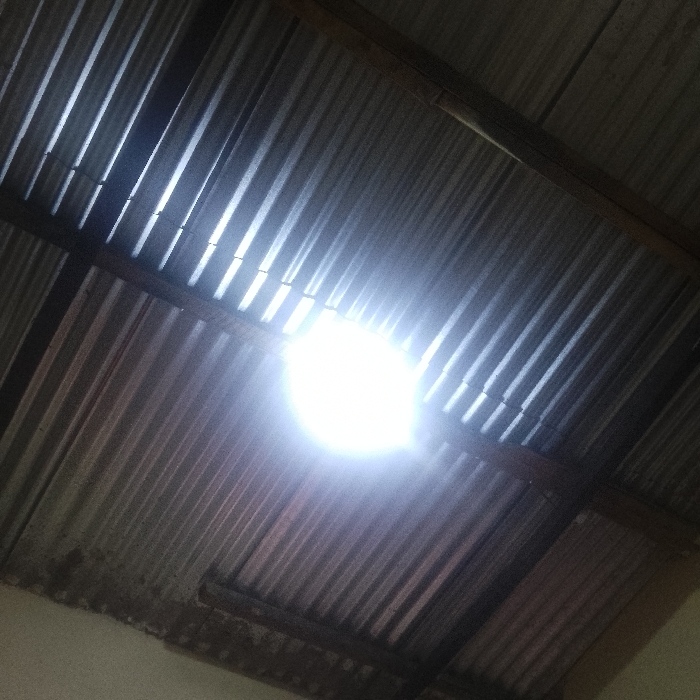 corrugated metal roof interior. The roof is supported by wooden beams. A bright, circular light source illuminates the metal, causing glare and obscuring details. The metal is grey and appears weathered, with repetitive grooves running across the frame. The angle is upward, suggesting a perspective from inside the structure.