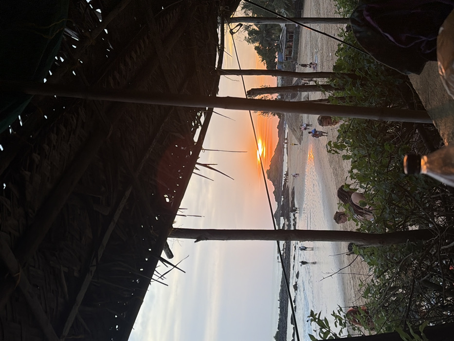 - "The image depicts a sunset view of a beach in Gokarna, India, observed from under a dark, thatched roof structure with prominent wooden support poles" by FM-EaPvq1, licensed under CC BY 4.0