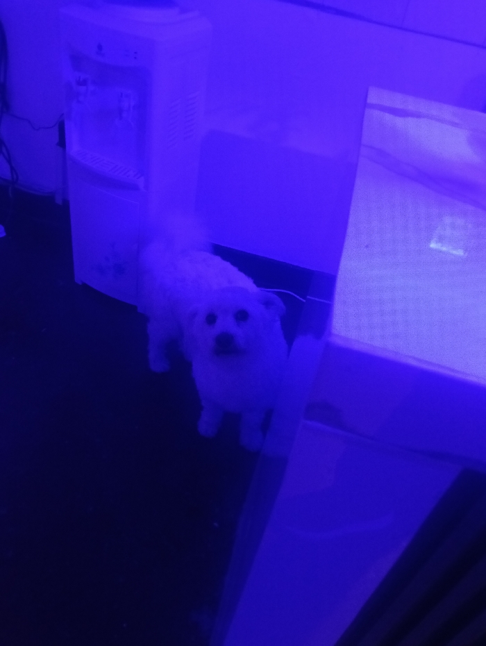 The scene, specified as an indoor location in Nairobi, Kenya, is illuminated by a dominant blue light source, casting a monochromatic blue hue across all visible elements. A small, white, fluffy dog, possibly a Spitz-type, stands in the lower-center of the frame, facing directly towards the camera with its mouth slightly agape. To the left, a white, floor-standing water dispenser with a top-loading water bottle is visible, its front panel details obscured by the lighting. Electrical wiring is partially visible near the base of the dispenser. To the right, a large, light-colored, vertical surface, consistent with a piece of furniture or a bed frame, extends upwards, showing some texture. The floor is a dark, solid surface. No human individuals are present in the image.