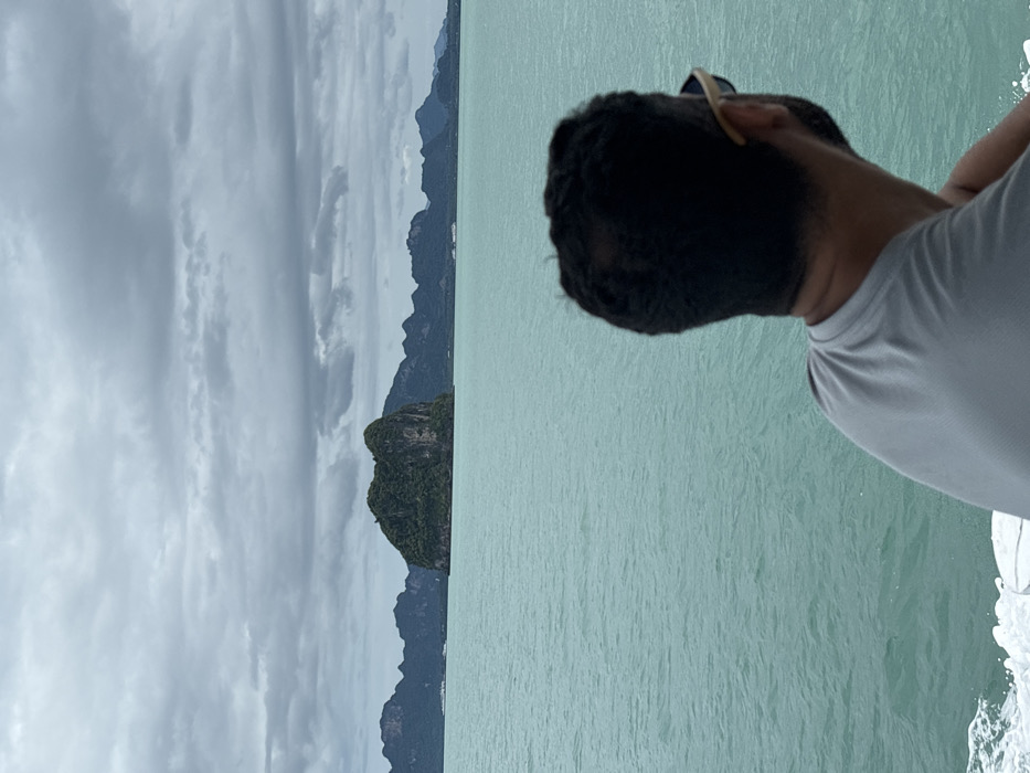A male subject, viewed from the back and right side, is situated on a vessel in the waters near Don Sak, Thailand. He has short, dark hair and wears a light grey t-shirt and sunglasses with light brown frames, which are visible on the right side of his head. He is looking towards the right, out over a vast expanse of turquoise-green water. A white wake in the lower left foreground indicates the vessel's movement. In the middle distance, a prominent, steep, and heavily vegetated island rises from the water. Beyond this, a series of hazy, dark green mountainous islands or landmasses extends across the horizon. The sky is overcast with a blanket of grey clouds.