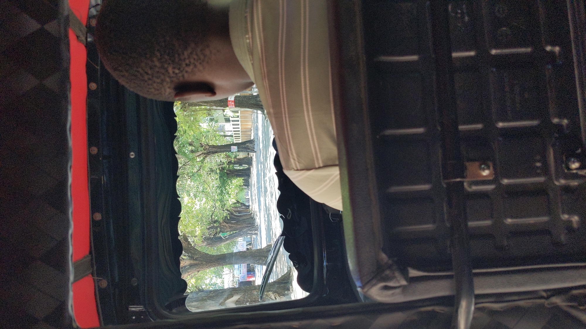 The image is taken from inside a vehicle, possibly an auto rickshaw (tuk-tuk), facing a street lined with mature trees in Dar es Salaam, Tanzania. Part of a person's head and upper torso are visible within the vehicle, wearing a striped shirt. The street view shows a row of trees on either side, creating a shaded avenue with sunlight filtering through the foliage. A fence can be seen in the background on the right. The vehicle's interior elements are visible, including the frame and seating.