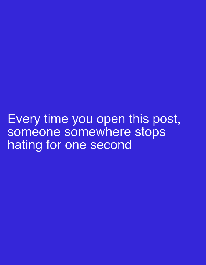 The image displays a digital graphic on a solid deep blue background. White, sans-serif text is centered horizontally in the lower portion of the frame, spanning three lines. The text reads: "Every time you open this post, someone somewhere stops hating for one second". There are no visible people, physical objects, actions, or environmental details depicted within the image content. The image itself provides no geographical location; however, per request, the associated location is Baan Chaweng, Thailand.