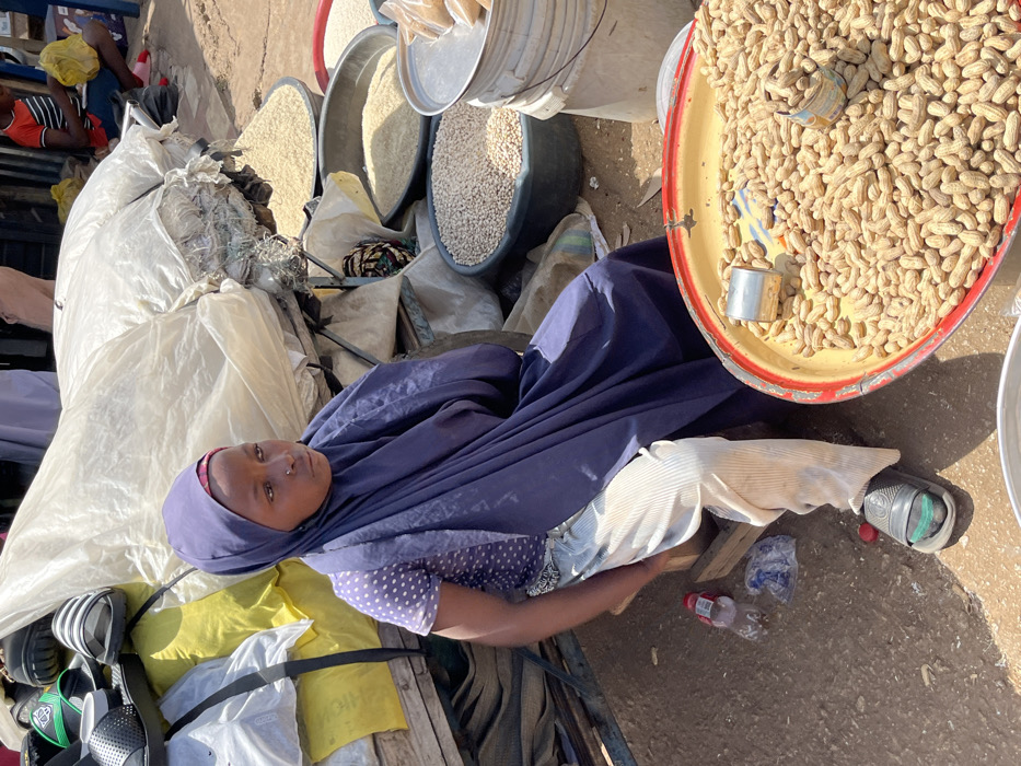 This image depicts an outdoor market scene in Jos, Nigeria, observed under bright daylight. A young female, appearing to be a vendor, is seated on a low wooden stool in the foreground, facing towards the right side of the frame with a neutral expression. She wears a purple hijab draped over a blue and white polka-dot short-sleeved top, light-colored pleated trousers, and dark sandals on her feet, with a green strap visible on the left sandal, worn over a dark sock. She has a nose piercing. To her immediate right, a large, round, yellow metal tray with a red rim is filled with raw peanuts in their shells. Two small, cylindrical metal cans are placed within the peanuts. Behind the seated individual, to the left, is a makeshift stall display featuring a stack of assorted sandals or flip-flops in black, green, and striped patterns. Directly behind her and extending to the upper right background are large, white plastic tarpaulins or sacks, possibly containing goods or providing shade. To the right of the seated individual, in the midground, multiple large, dark-colored plastic or metal bowls are arranged on the ground, filled with various dry goods. These include lighter-colored grains (likely rice) in upper bowls and smaller, light-colored legumes (possibly beans or peas) in lower bowls. A stack of silver metallic buckets or containers is visible to the right of these bowls. The ground is dry, dusty earth. In the distant upper right background, another individual wearing a red and white striped shirt is partially visible, seated near more sacks and holding a yellow plastic bag. A plastic water bottle with a red cap and a crumpled plastic bag lie on the ground near the feet of the main subject.