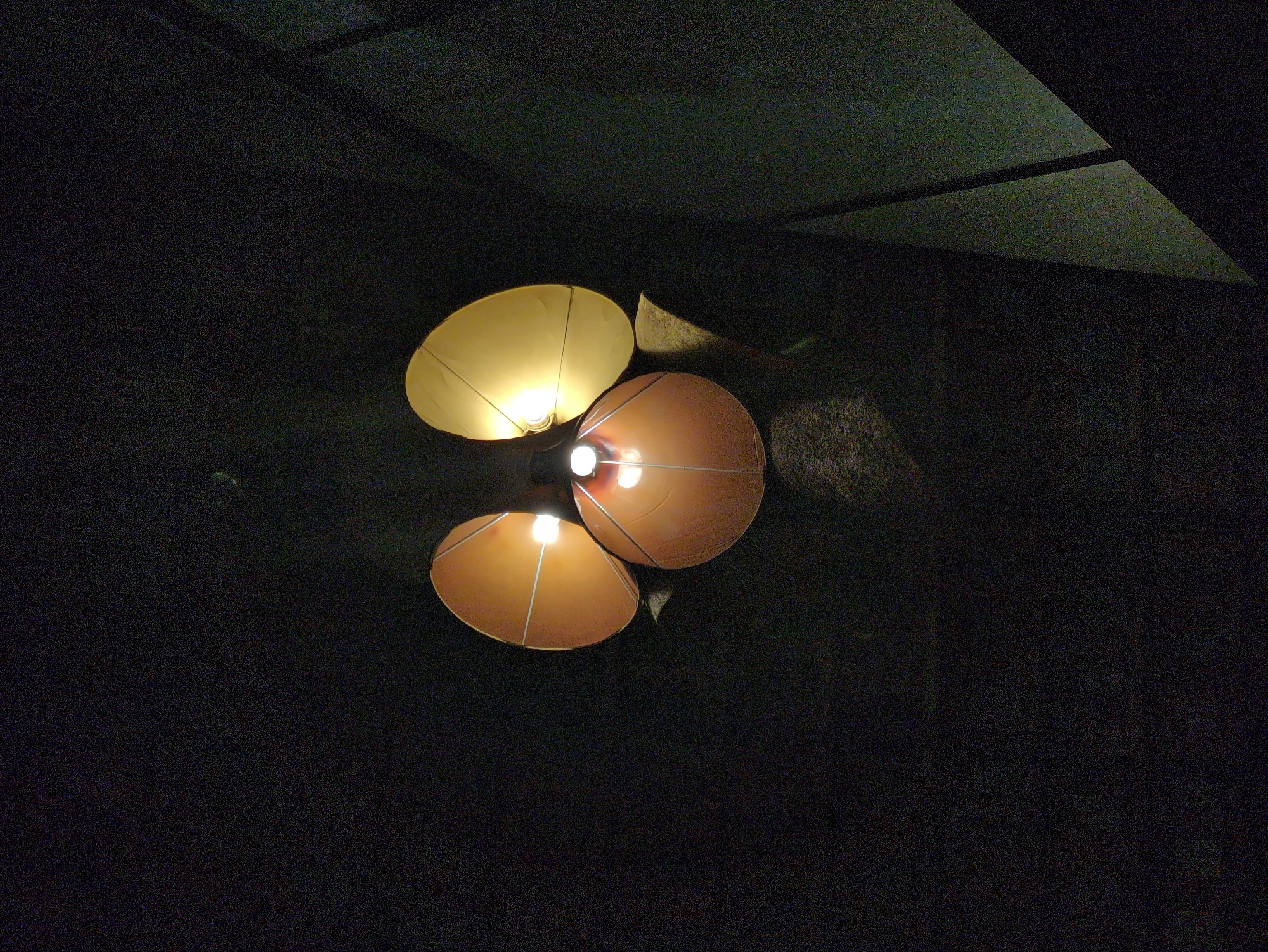 The image depicts a low-light scene of a ceiling-mounted light fixture with four semi-spherical shades, three of which are visibly illuminated. The shades appear to be constructed from a translucent material, possibly fabric or paper stretched over a frame. The light emanating from the shades suggests a warm, ambient illumination. The ceiling itself is dark and features a grid-like pattern of recessed panels. The environment surrounding the light fixture is predominantly dark, with minimal discernible detail. It is not possible to determine the location of the scene within Bengaluru, India or any information about people or actions from the image provided.