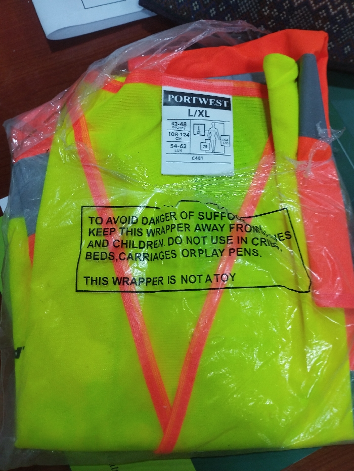 - "yellow safety vest with two orange reflective stripes, folded and packaged in a clear plastic bag" by FM-NWFJ03, licensed under CC BY 4.0