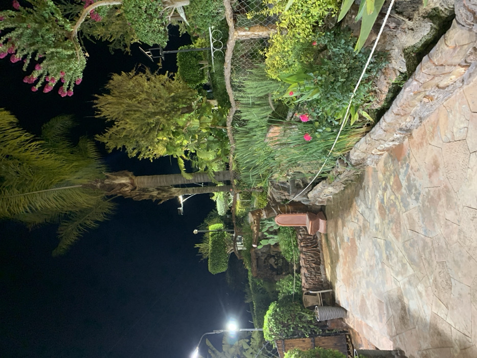 A nighttime view shows lush landscaping with a stone-paved patio. A palm tree and various flowering bushes add greenery. The patio edge is defined by a raised stone border with plants spilling over. In the distance, manicured hedges and garden lights illuminate the scene. A metal fence provides a backdrop, suggesting a garden or park setting.