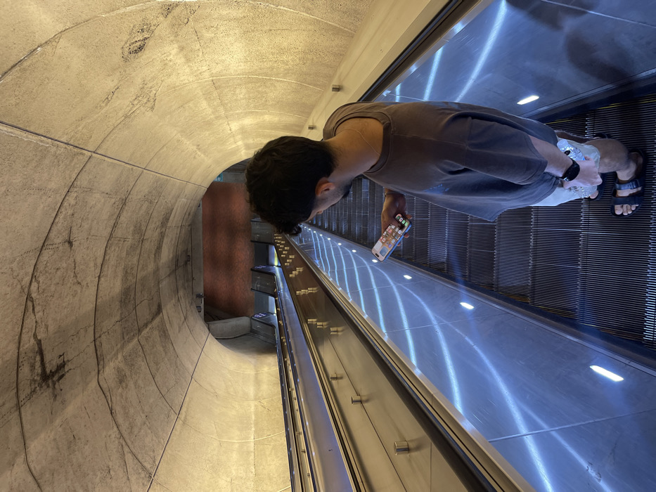 One male individual is depicted descending a long escalator within an underground Washington Metro station in Arlington, United States, likely Rosslyn or Crystal City station, based on the architectural style and depth. The subject is viewed from a high-angle perspective, from behind and over the right shoulder. He wears a dark brown short-sleeved t-shirt, light-colored shorts, and dark sandals. His dark, curly hair is visible. In his right hand, he holds a white smartphone with its screen illuminated, displaying a grid of application icons. A dark wristwatch is present on his left wrist, and a clear plastic water bottle is partially visible in his left hand. The environment consists of a large, vaulted concrete tunnel with visible panel seams, characteristic of Brutalist architecture. The concrete walls are illuminated, creating a warm glow. Three parallel escalators are visible, all descending. The escalator the subject is on features integrated blue LED lighting along its side panels, forming a wavy pattern. At the bottom of the escalators, a section of wall covered in reddish-brown material, resembling brick or tile, is discernible.