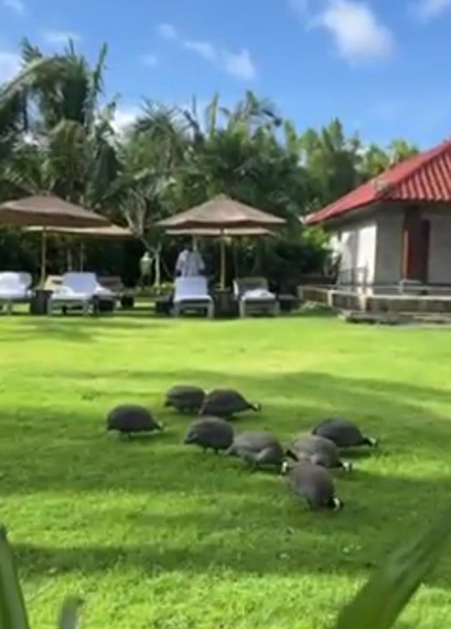 green lawn with a flock of guinea fowl in the foreground. In the background, a resort employee in a white uniform is arranging towels on lounge chairs beneath beach umbrellas. The setting suggests a tropical resort, indicated by palm trees and a building with a red-tiled roof. The camera seems to be at ground level, looking across the lawn towards the lounge area. The sky is partly cloudy, suggesting a sunny day.