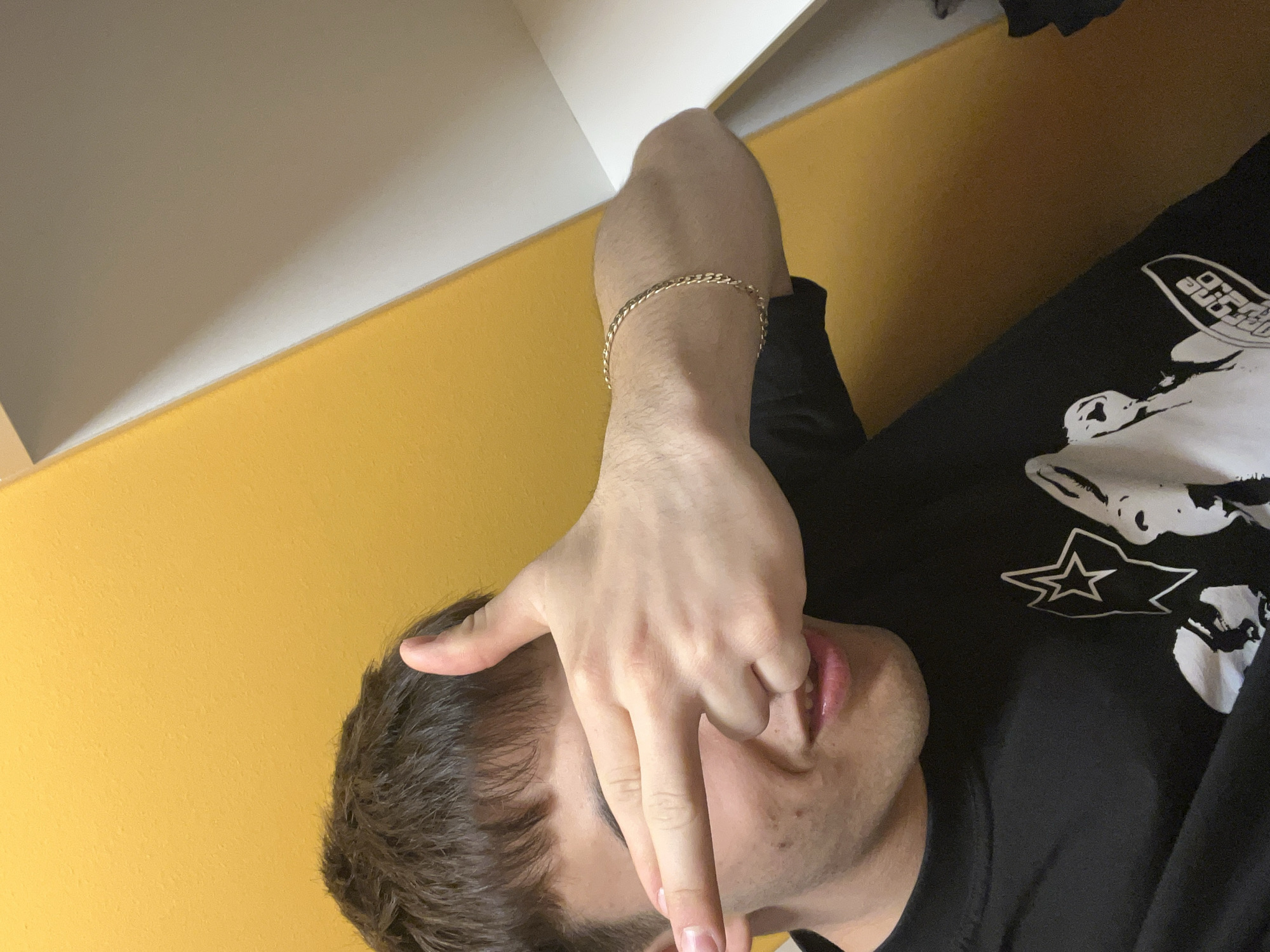 This image depicts a single male individual indoors in the city of Marten, Bulgaria. The subject, a young adult with short brown hair, is positioned facing forward, visible from the chest up. He is wearing a black crew-neck t-shirt featuring a white graphic design that includes a star and a stylized animal head. A gold-colored chain bracelet is present on his right wrist. The individual's right hand is raised, partially obscuring his face. His thumb is extended upwards, and his index finger is extended forwards, covering his left eye, while the remaining fingers are curled, partially covering his right eye and upper nose. A slight smile is visible on his lower face, with teeth partially exposed. The background consists of a textured, bright yellow wall to the left and a white interior corner or shelving unit to the right.