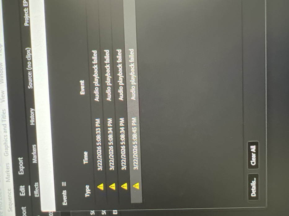 The image displays a computer monitor showing a software interface, likely a video editing application such as Adobe Premiere Pro, indicated by "Pro 2023" partially visible at the top left. The top menu bar includes options like "File," "Edit," "Export," "Sequence," "Markers," "Graphics and Titles," "View," "Window," and "Help." The "Edit" tab is highlighted. A prominent panel labeled "Events" is visible, presenting a tabular log of system occurrences. This panel contains three columns: "Type," "Time," and "Event." Under the "Type" column, four yellow warning triangle icons are displayed. The "Time" column lists four entries dated "3/22/2026" with specific timestamps: "5:08:33 PM," "5:08:34 PM," "5:08:34 PM," and "5:08:45 PM." Correspondingly, the "Event" column displays "Audio playback failed" for all four entries. The last entry, "3/22/2026 5:08:45 PM," is highlighted, suggesting it is currently selected. Below the event log, two clickable buttons are present: "Details..." and "Clear All." Other visible tabs in the software interface include "Effects," "Markers," "History," "Source: (no clips)," and "Project: EP." The image is a direct photograph of a digital screen, showing screen pixels and minor glare. There are no visible individuals, external physical objects, or environmental details that could indicate a physical location. The image content does not provide any information regarding the city of Sofia, Bulgaria, or any specific geographical location.