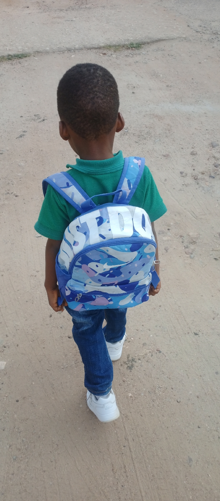A child from the back wears a green polo shirt and jeans. On his back, he has a blue backpack that appears to be a Nike brand. The child also wears white shoes. The photo is taken outdoors on a dirt road.