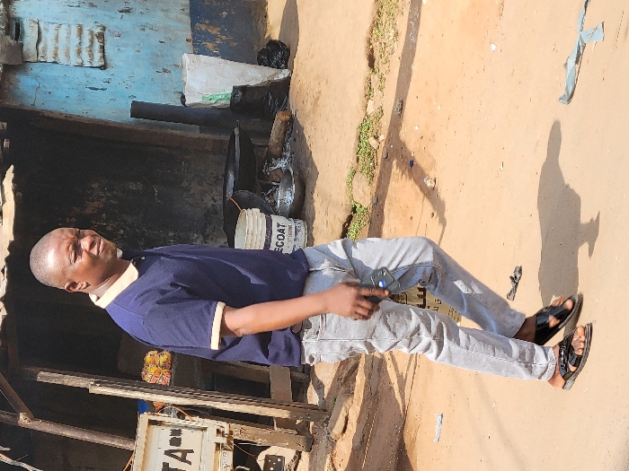A male individual, appearing middle-aged with short hair, walks from left to right across a dry, reddish-brown dirt path in Onitsha, Nigeria. He wears a navy blue polo shirt with a light-colored collar and sleeve cuffs, light grey denim jeans, and black open-toed sandals. He holds a dark-colored smartphone in his right hand. The background features a dark, unpainted wooden structure with a corrugated roof on the left, partially obscuring a white sign with black text. Further right, behind the man, is a light blue building with peeling paint and a small, high-set window. In the mid-ground, a white bucket labeled "ECOAT," a metal bowl, and a makeshift cooking area with a large black pot over logs are visible. A tall white sack and black plastic bags are situated near the blue building. Scattered debris is present on the ground. Strong sunlight from an unseen source casts clear shadows.