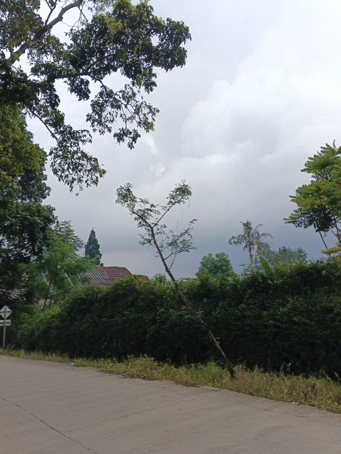 This image depicts an outdoor environment in Vang Vieng, Laos, under a heavily overcast sky with varying shades of grey clouds. A light grey paved road or path occupies the lower-left to mid-right foreground. Adjacent to the road's right edge, a strip of dry, sparse green and yellow vegetation is visible. A dense, dark green hedge, approximately chest-height, extends horizontally across the mid-ground, acting as a visual barrier. Behind the hedge, on the left side, the red-tiled roof of a building is partially visible, topped by a tall, slender evergreen tree with a pointed apex. Towards the right side, behind the hedge, a distinct palm tree with frond-like leaves stands out, accompanied by other green foliage. A thin, sparsely-leafed tree with a diagonal trunk, leaning to the right, is positioned in the mid-left foreground, with faint, thread-like material visible hanging from its branches. Large, dark green tree branches with dense foliage frame the upper-left quadrant of the sky. In the far lower-left, a white, pole-mounted sign with two horizontal bars is partially visible on the roadside. No people, subjects, or actions are present.
