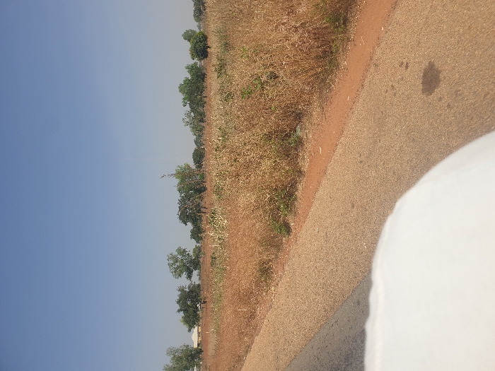 The image displays an outdoor scene in Kujama, Nigeria, under a clear, light blue sky. The lower left quadrant is partially obscured by an indistinct white object. An asphalt road is visible in the lower left, transitioning into a light brown gravel shoulder or dirt path that extends diagonally towards the right. A dark, irregular stain is present on this paved surface near the bottom center. Adjacent to the path on the right is an expanse of dry, light brown and yellowish vegetation, consistent with dormant crops or weeds. In the background, a line of trees with varying foliage density stretches across the frame. A light-colored building with a dark roof is partially visible behind the trees on the far left. A tall, thin structure, possibly a communication mast, is faintly discernible rising above the distant treeline on the right. No individuals or active subjects are present.
