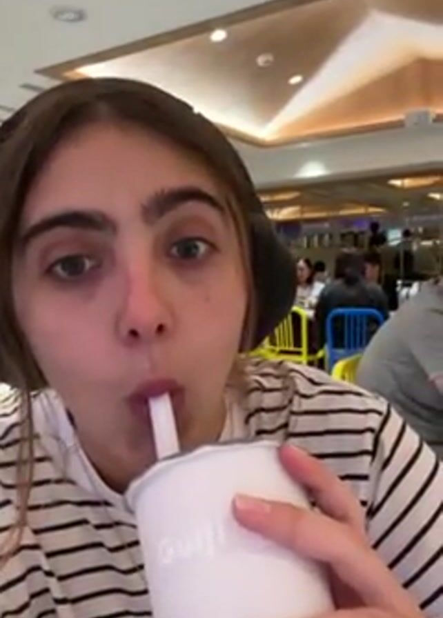 A young woman with brown hair and eyes, wearing a striped shirt and headphones, is drinking from a white cup with a straw. She's looking at the camera, making a pouting face as she drinks. The cup has "Guuji" printed on it. The background shows a brightly lit indoor dining area with other people seated at tables. Blue chairs are visible, as is a decorative ceiling.