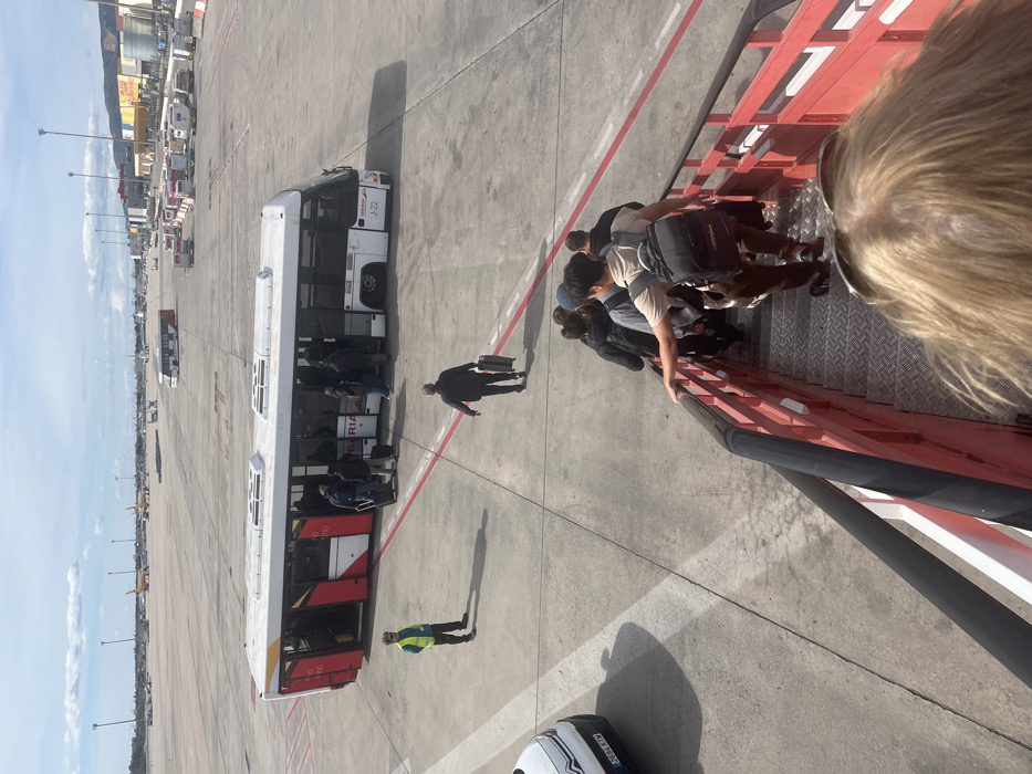 The scene depicts an airport apron at Josep Tarradellas Barcelona-El Prat Airport in El Prat de Llobregat, Spain, under a partially cloudy sky. In the immediate foreground, the top of a person's head with blonde hair and sunglasses resting on top is visible, looking down. Below, a line of approximately seven passengers, mostly seen from behind, are descending a set of red-framed metal mobile air stairs equipped with a black handrail. These passengers carry various backpacks and small bags. On the concrete apron, a white airport transfer bus, identified with "IBERIA" branding and "J-22" on its front, is parked. Multiple doors on the bus's left side are open, and numerous passengers are actively boarding it. To the left of the bus, a male airport ground staff member, wearing a yellow high-visibility vest over a dark long-sleeved shirt and dark trousers, stands facing the bus. Another male passenger, seen from behind, walks towards the bus, pulling a black wheeled suitcase. A partial view of a white Citroën vehicle, displaying license plate "2694 KTW", is present in the lower-left corner. The concrete apron features red painted demarcation lines. In the mid-ground and background, other airport buses, rows of baggage handling carts, fuel trucks, and several aircraft are visible, along with distant airport buildings, one of which displays "DHL" branding.