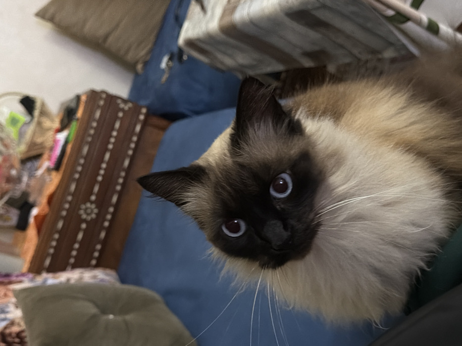 A fluffy Balinese cat with striking blue eyes and a dark brown face, ears, and paws peers curiously into the camera