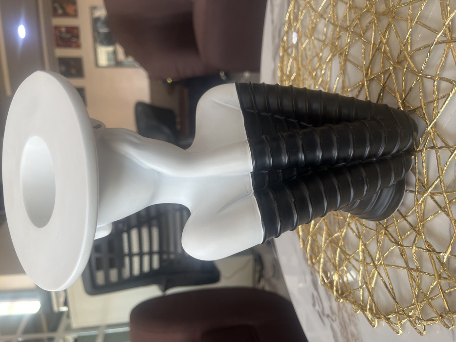 A monochrome abstract decorative sculpture, depicting the upper torso and head-level area of a human figure viewed from the back, stands centrally on a white, gray-marbled tabletop. The sculpture's upper portion, including the neck and a flat, circular head-plate, is white. The lower portion, representing the torso and arms bent upwards, is black with horizontal ribbed detailing. This sculpture rests on a circular, golden, loosely woven metallic placemat. The background is an out-of-focus indoor environment featuring dark brown upholstered armchairs or sofas on the left and right, and a black mesh office chair. A wall behind the furniture displays multiple framed artworks. A bright light source is visible on the ceiling. This scene is located in Gura Top, Nigeria.