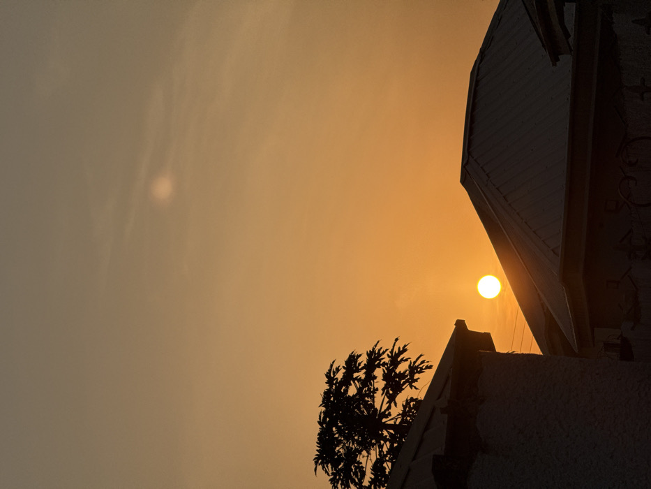 An orange sky suggests either sunrise or sunset. A bright, round sun is partially obscured by a building's silhouette on the right. A smaller tree or bush is seen against the sunlit sky on the lower left. The overall scene is bathed in a warm, golden light, creating strong contrasts between the illuminated sky and the shadowed objects in the foreground.