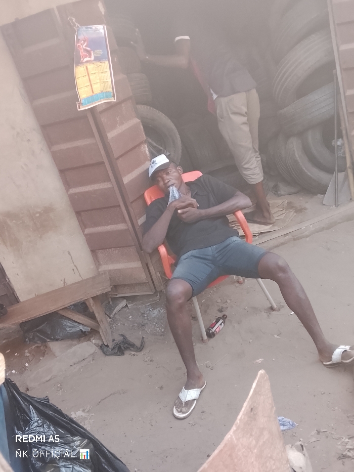A man in a baseball cap, dark polo shirt, and shorts sits in an orange chair, drinking from a bottle. He wears flip-flops and is positioned outside what appears to be a tire shop, given the stacks of tires visible in the background. Another person stands partially visible behind him inside the shop. A calendar hangs from the building. A discarded bottle lays on the ground.