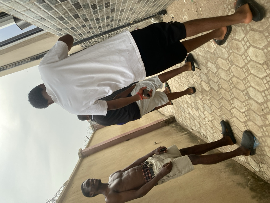 Three men stand in a row outdoors, shot from a high angle. The first man, in a white t-shirt and black shorts, is followed by a man in a black t-shirt and light gray shorts holding a phone. The third man is shirtless, wearing khaki shorts with a checkered pattern, and is smiling. All three wear dark-colored slide sandals. The backdrop shows a wall topped with barbed wire and tiled flooring. The sky is overcast.