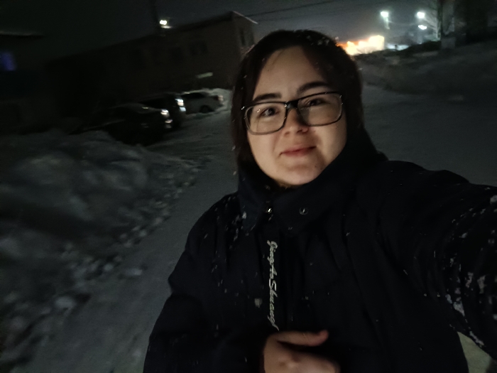A person with dark hair and glasses stands in a snowy, dark environment. They wear a black puffer jacket, partially zipped, revealing a white drawstring with text. Buildings and parked cars are visible in the background, illuminated by streetlights and snow. The person appears to be taking a selfie. Snowflakes are visible on their jacket and in the air.
