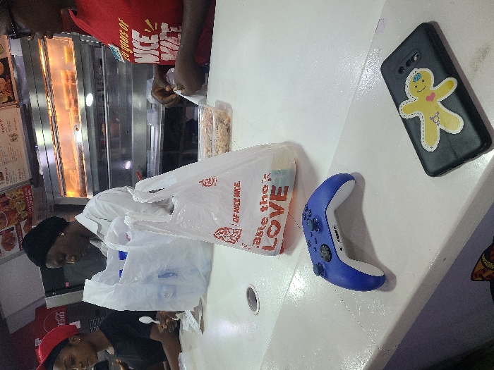 A fast-food restaurant scene with three people visible. A counter holds a plastic bag with "Taste the Love" printed on it, a blue gaming controller, and a black phone case decorated with a gingerbread man. One person in a red shirt stands behind the counter serving food, while two other individuals, one wearing a white uniform and another in a red cap, are seated in front. The restaurant interior features a menu board and a display of food preparation.