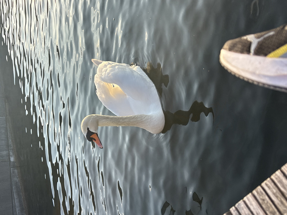 An adult Mute Swan (Cygnus olor) with pristine white plumage and an orange beak featuring a prominent black basal knob is observed floating on a body of dark, rippled water. The swan is positioned slightly right of center, facing left, with its long neck upright. Sunlight, originating from the right, illuminates the swan's back and wings, creating bright highlights. A distinct, elongated reflection of the swan is visible beneath it on the water's surface, distorted by the ripples. In the upper left background, a dark, structured concrete or stone embankment is visible, indicating a constructed waterway. The lower left foreground reveals the weathered wooden planks of a jetty or dock. The tip of a black, white, and yellow athletic shoe is present in the lower right foreground, suggesting a human observer's low vantage point at the water's edge. This scene is consistent with the environment of Phoenix Lake (Phoenix See) in Dortmund, Germany, which features such artificial lakes, concrete embankments, and public wooden access points where swans are commonly found.