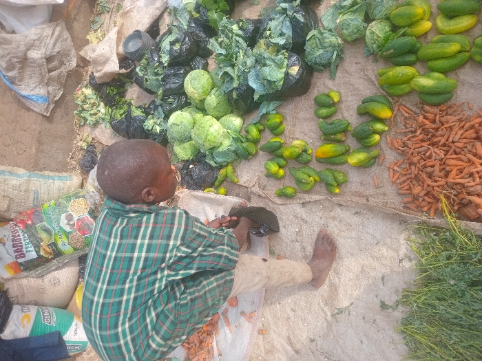 An individual is depicted actively working at an outdoor vegetable market stall in Kawo, Nigeria