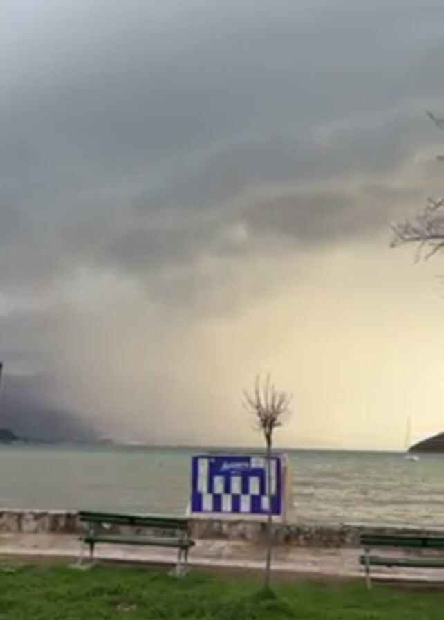 coastal scene under a cloudy sky. Rain appears to be falling in the distance over the water. In the foreground, there's a grassy area with a walkway, benches, and a few leafless trees. A sign with blue and white squares is visible. In the distance, a sailboat can be seen on the water. A person is standing on the walkway, taking a photo.