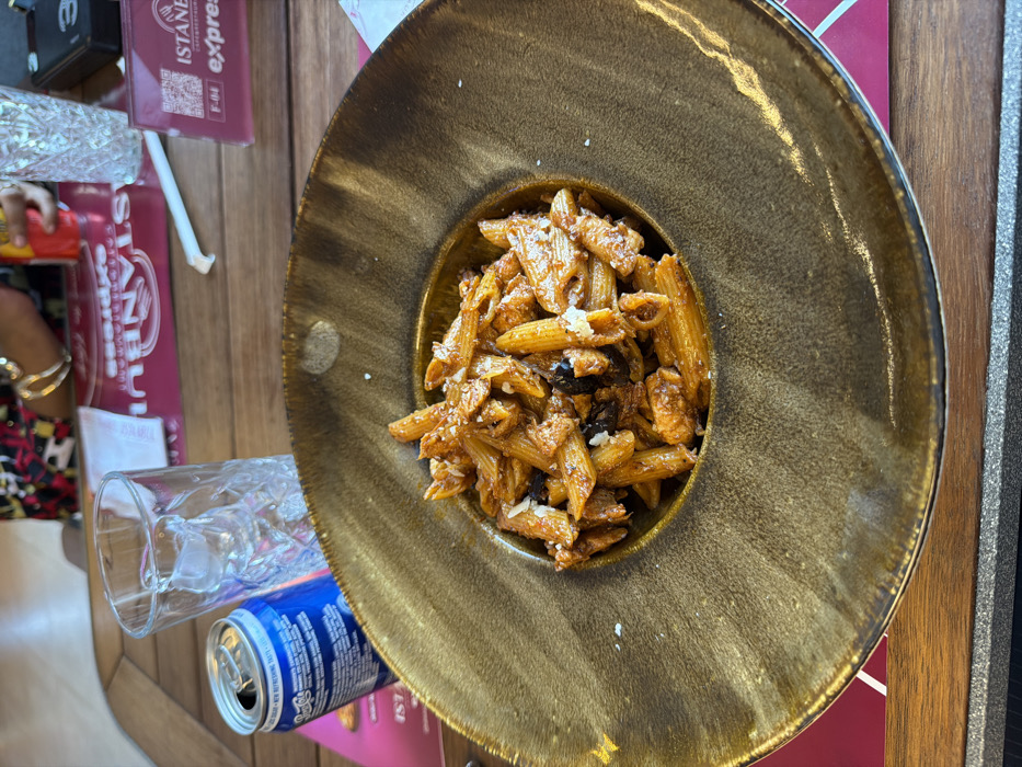 The image displays a dining scene inside an Istanbul Express restaurant, located in Karum, Nigeria. A prominent, large, dark gold-colored bowl-plate centrally features a serving of penne pasta coated in a reddish-orange sauce. The pasta is mixed with visible pieces of what appears to be chicken or meat, several black olive slices, and is lightly garnished with grated white cheese. To the immediate left of the pasta dish, an opened blue Pepsi brand soda can stands next to a clear, textured drinking glass containing ice. A second identical clear, textured drinking glass, also containing ice, is partially visible in the upper right background. The table surface is made of wood. Beneath the items, red placemats or menus are present, clearly displaying "ISTANBUL EXPRESS" branding, a fork and knife logo, and a QR code with "F-04." A small white packet, possibly a condiment, and a white plastic straw are also observed on the placemat. In the blurred background, partial views of two individuals are discernible. One person, positioned to the left, is wearing a multi-colored patterned top and a gold-colored bangle on their wrist. The other individual, on the right, is less distinct, with only a portion of their arm and hand visible near the second glass. The scene portrays patrons seated at a table, presumably during a meal.