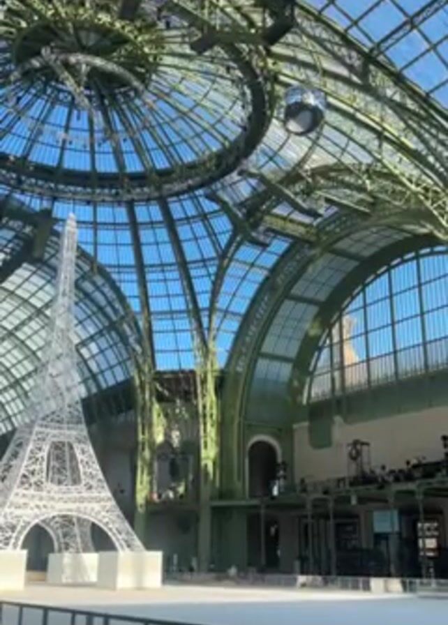 interior of the Grand Palais Éphémère in Paris, France. A large model of the Eiffel Tower stands on what appears to be an ice skating rink. Above, a mirrored disco ball hangs from the glass and metal arched ceiling structure. The architectural details of the building are prominent, highlighting its intricate ironwork and glass panels that let in natural light. People can be seen on an upper level in the background.