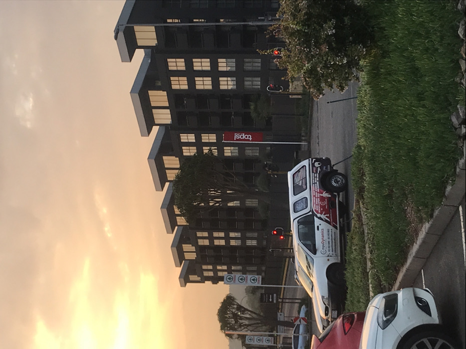 The image depicts an urban scene in Germiston, South Africa, likely near Victoria Place or Victoria Centre, under a golden-orange sunset sky
