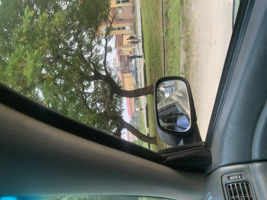 From inside a car, the view showcases a large, leafy tree leaning over a street. In the background, buildings and a few people are visible. The car's side mirror reflects a partial view of the car behind it. The interior of the car, including the dashboard and window frame, is also within the frame, contributing to the perspective from within a vehicle.