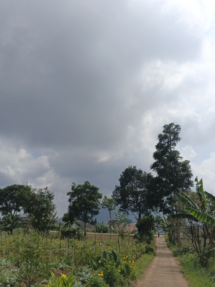 A dirt road stretches into the distance, flanked by lush vegetation and trees. Cultivated plants and crops flourish in the foreground, interspersed with small yellow flowers. Houses are visible in the background, nestled among the greenery. A person walks along the road. Overcast skies dominate the scene, with dark gray and white clouds creating a dramatic backdrop. Hints of blue sky peek through the cloud cover.
