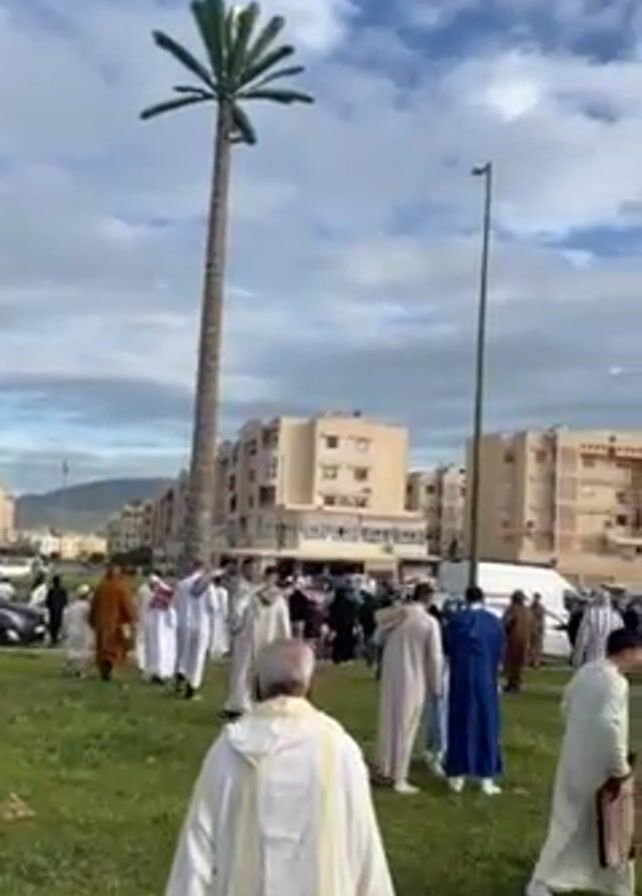 large group of people, mostly men, dressed in traditional Muslim clothing walking on a grassy area toward a white mosque with a tall minaret. The sky is cloudy. In the background, there are residential buildings. In the foreground, there is a tall structure resembling a palm tree, possibly a cell tower disguised as a tree. The people are walking towards the mosque, likely for prayer.